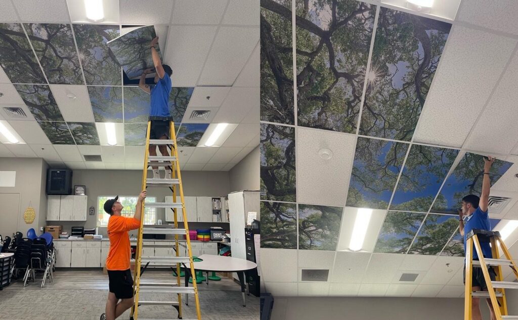 Today, the program installs high-resolution “tree ceiling” murals designed specifically for learning spaces. These ceilings are now in 20 school districts across nine states, serving more than 10,000 students. The results are consistently powerful: students are calmer, more focused, and more excited to be in school. Teachers report measurable improvements in classroom culture and attention.